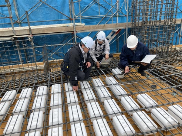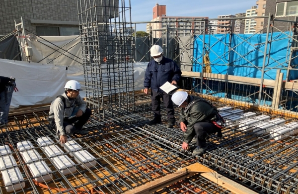 設計監理者による3階躯体(4階床)配筋検査状況です。