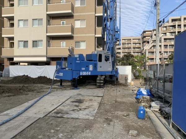 <モントーレ室見リバーサイド> 第1回報告書 安全祈願祭/土留め工事(H鋼鉄板連続壁工法)/土留め工事(地中連続壁工法)/建物配置・杭芯確認検査/試験杭・支持地盤確認検査/基礎下地盤改良工事/全景