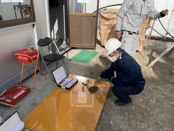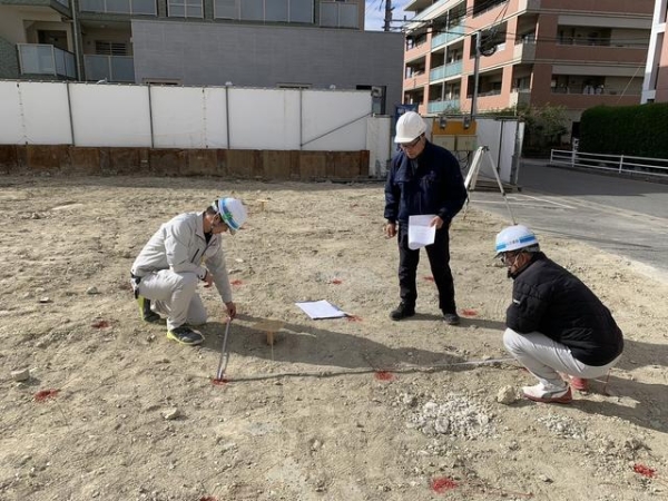 設計監理者による支持地盤確認検査の状況です。
